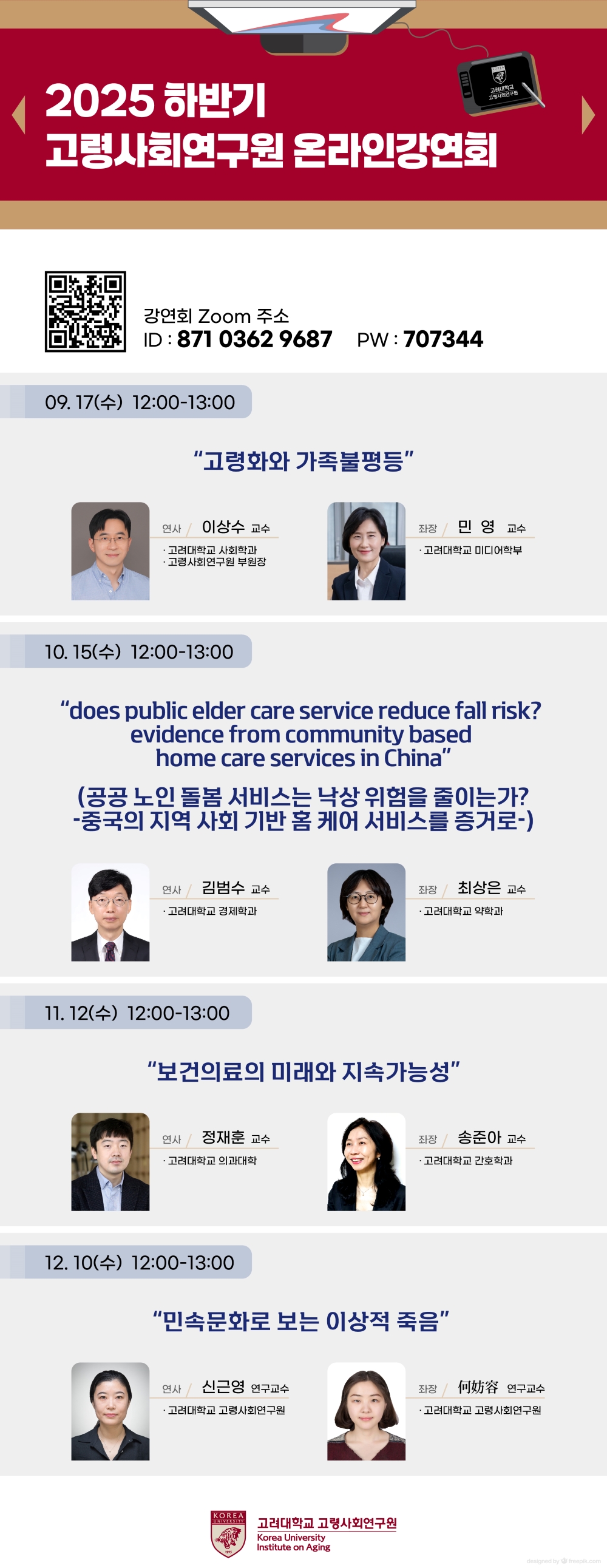 고려대학교 고령사회연구원은 급속한 고령화가 사회 전반에 미치는 영향을 탐구하고, 그 해법을 모색하는 다양한 연구와 담론의 장을 열어가고 있습니다. 2025년 하반기 매월 1차례씩 전문가를 초빙하여 여러분을 찾아갑니다. *참여 방법 : ZOOM ID 871 0362 9687 PW 707344