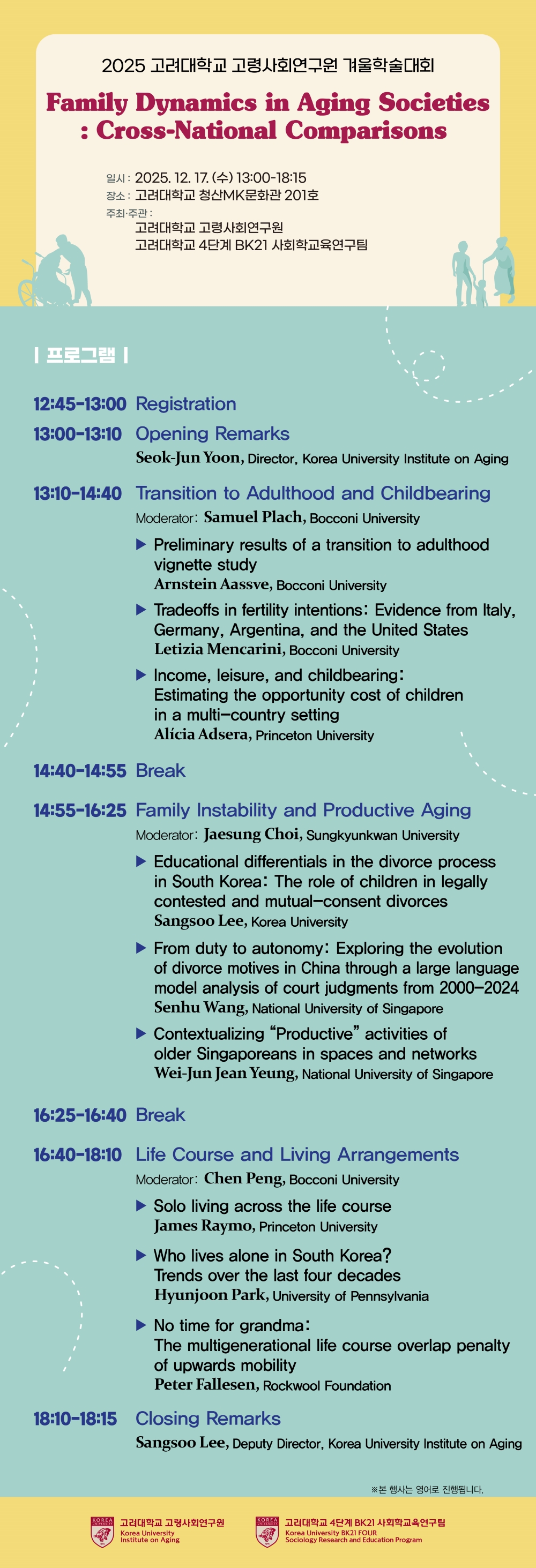 - 주제 : Family Dynamics in Aging Societies : Cross-National Comparisons